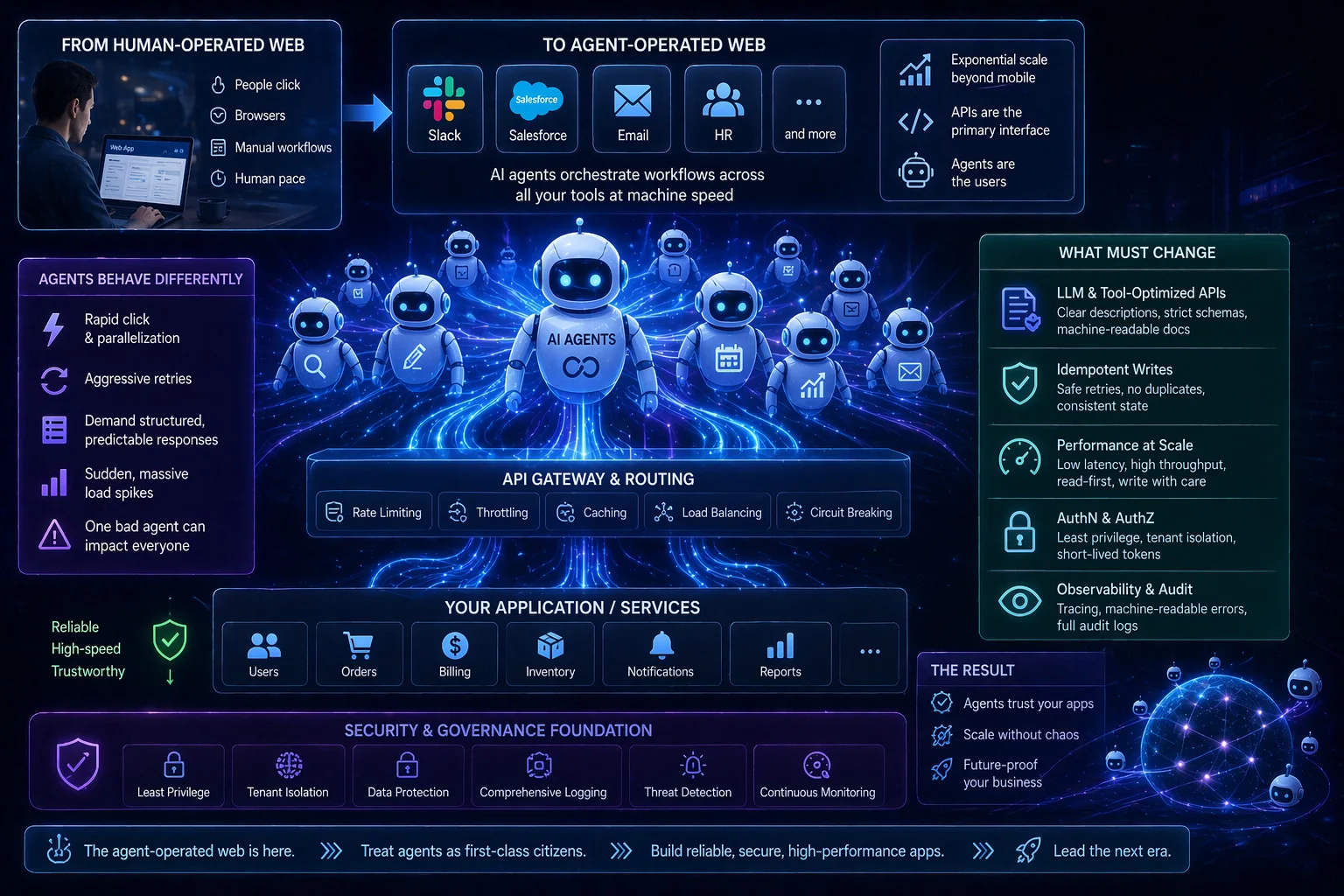 The agent-operated web is not coming; it is already arriving. Salesforce’s public pivot shows that even the largest enterprise platforms are racing to adapt. New agent-first applications will capture mindshare quickly, but the real opportunity belongs to teams that make their existing apps agent-ready today. The architectural changes are not cosmetic. They are foundational shifts in philosophy, performance expectations, reliability guarantees, and security posture. Make agents first-class citizens, and your application will thrive in the next era of the web. Treat them as an afterthought, and you risk watching your competitors pull ahead while you scramble to catch up. The choice is yours, but the clock is ticking.